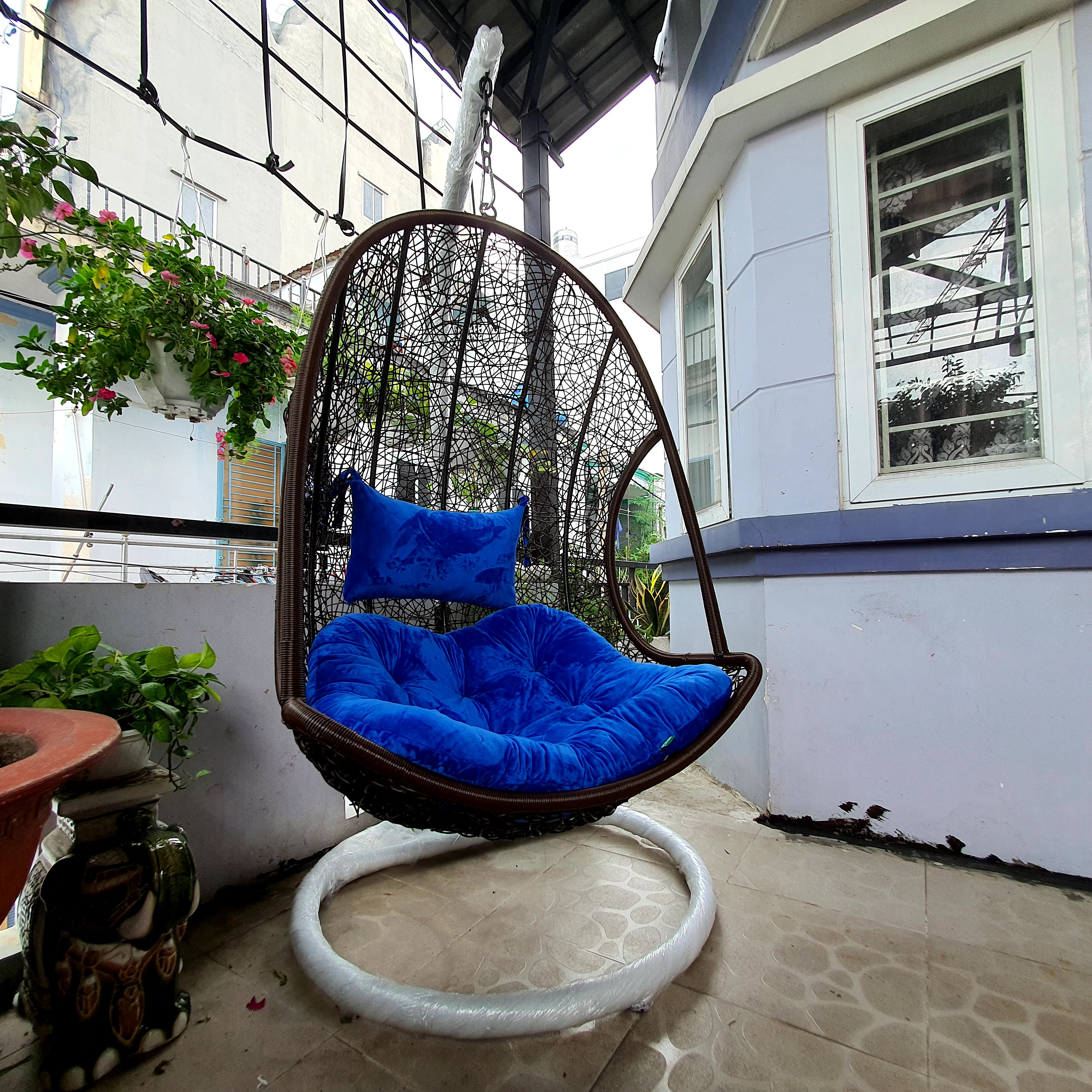 Bộ Xích Đu Rối Khung Trắng Và Ban Công , Đệm Màu Đỏ Tại Shop