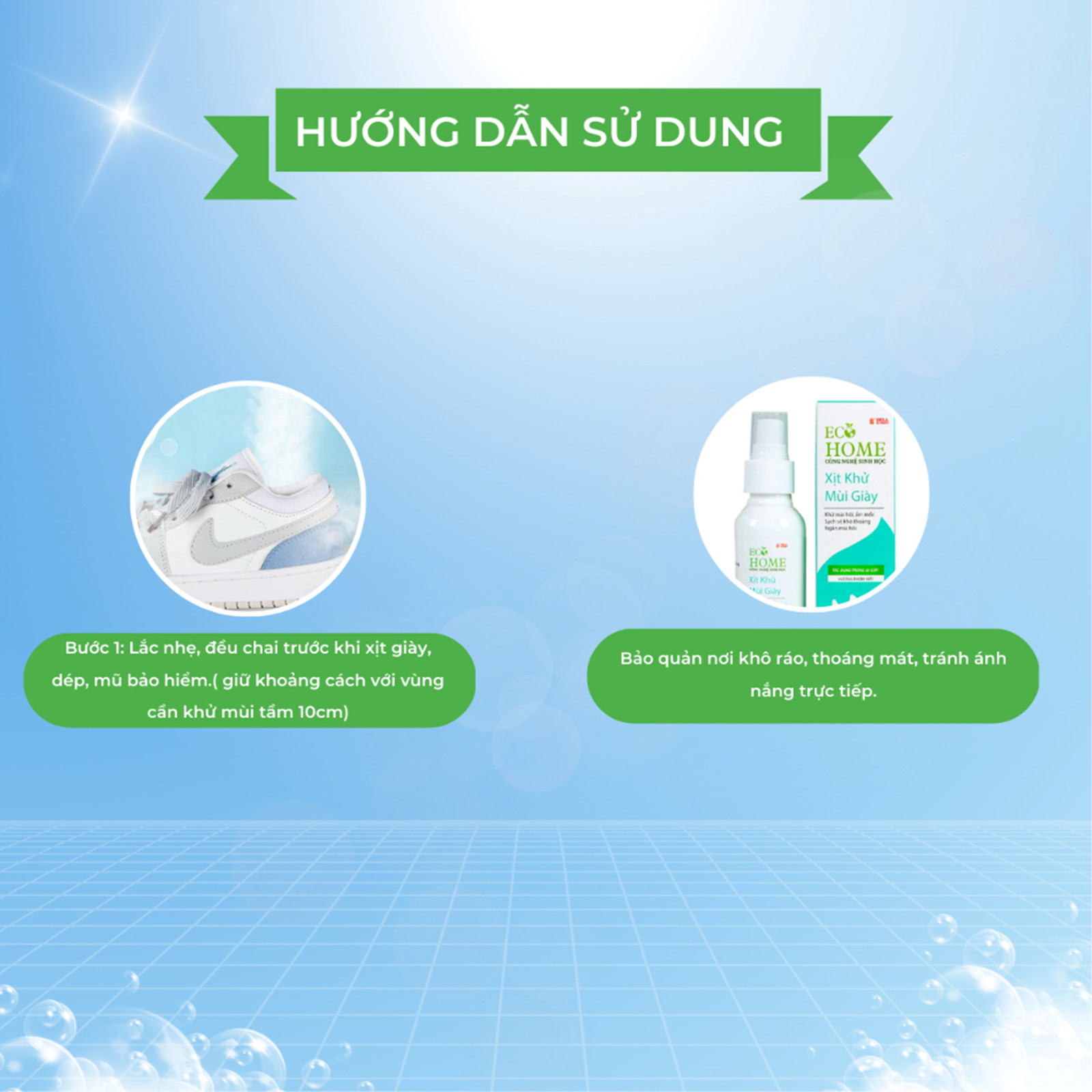 - Khử mùi giày, mùi hôi chân, mũ bảo hiểm. Giúp đôi chân luôn thoáng mát, sảng khoái, ngăn ngừa vi khuẩn gây mùi. HƯỚNG DẪN SỬ DỤNG: