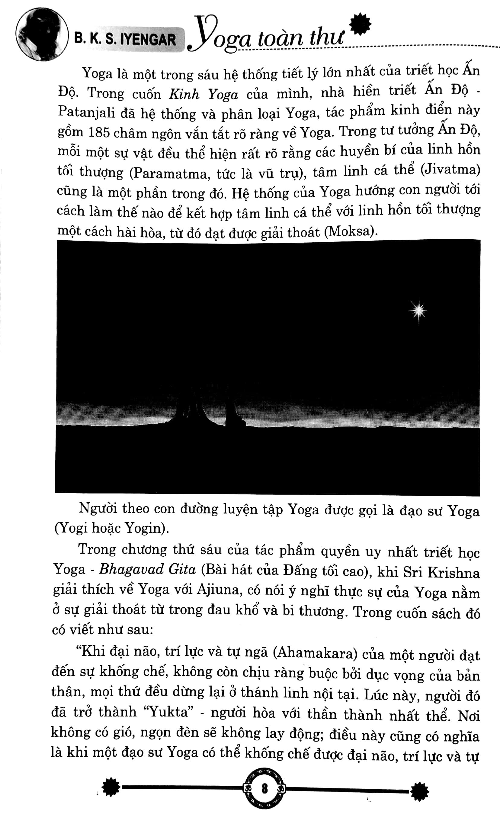 Yoga đã xuất hiện và luôn song hành với bề dày lịch sử của đất nước Ấn Độ, tuy vậy nhưng Yoga không thuộc quyền sở hữu của bất kỳ cá nhân hay một quốc gia nào cả, mà nó thuộc về nhân loại, thuộc về vũ trụ. Hiện nay, Yoga đối với con người đã không còn quá xa lạ, và nó vẫn thường được biết đến như một bộ môn thể thao rèn luyện cơ thể tăng cường sức khỏe. Nhưng ngoài những định nghĩa cơ bản đó, Yoga còn có một ý nghĩa vô cùng sâu sắc và có phần thần bí, Yoga được định nghĩa như một cầu nối Uô hình giữa tâm hồn và thể xác, là sự hợp nhất giữa con người và vũ trụ bao la huyền bí, hòa nhập giữa ý thức cá nhân với ý thức vũ trụ, rút ngắn khoảng cách giữa những cái mô hình và hữu hình, cái hữu hạn và vô hạn.